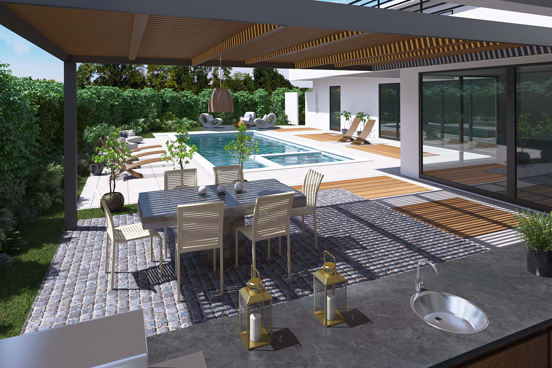 Renovation of house and redesign of garden and pool area. Overlay of new 3D elements onto client original photograp.