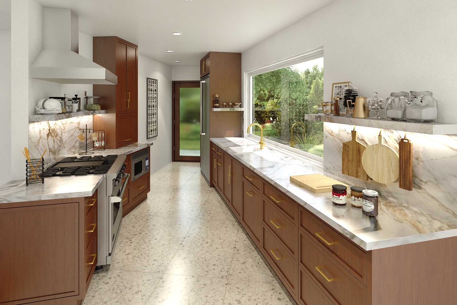 New kitchen design for client. Renders done in dark and light stain wood, and different stone floors to match.
