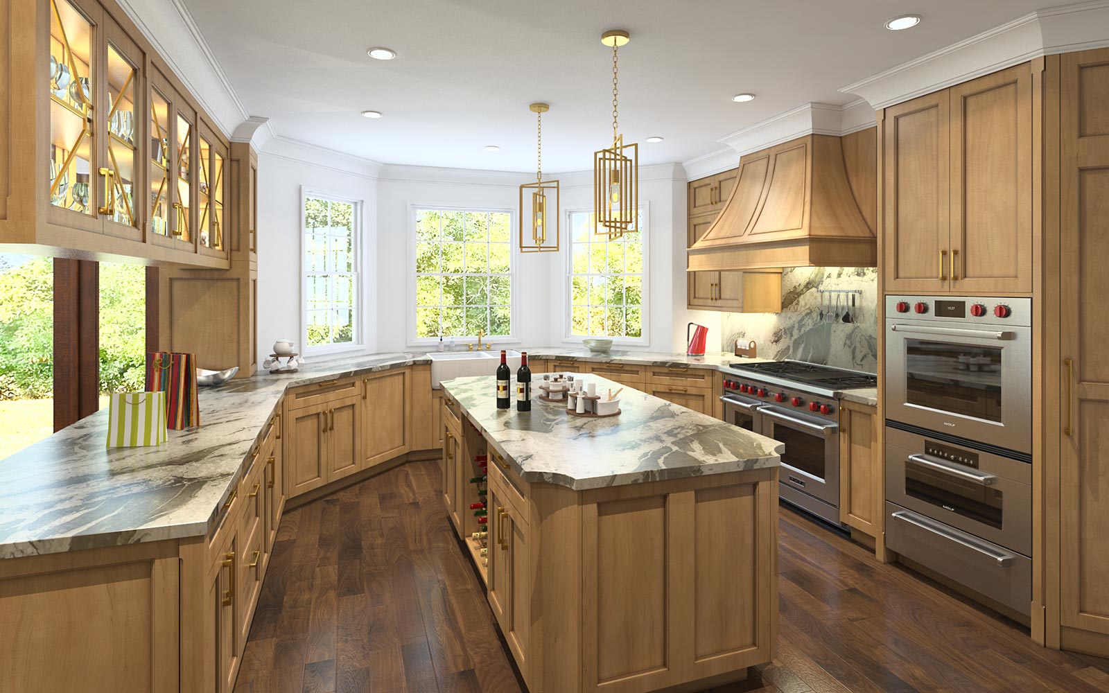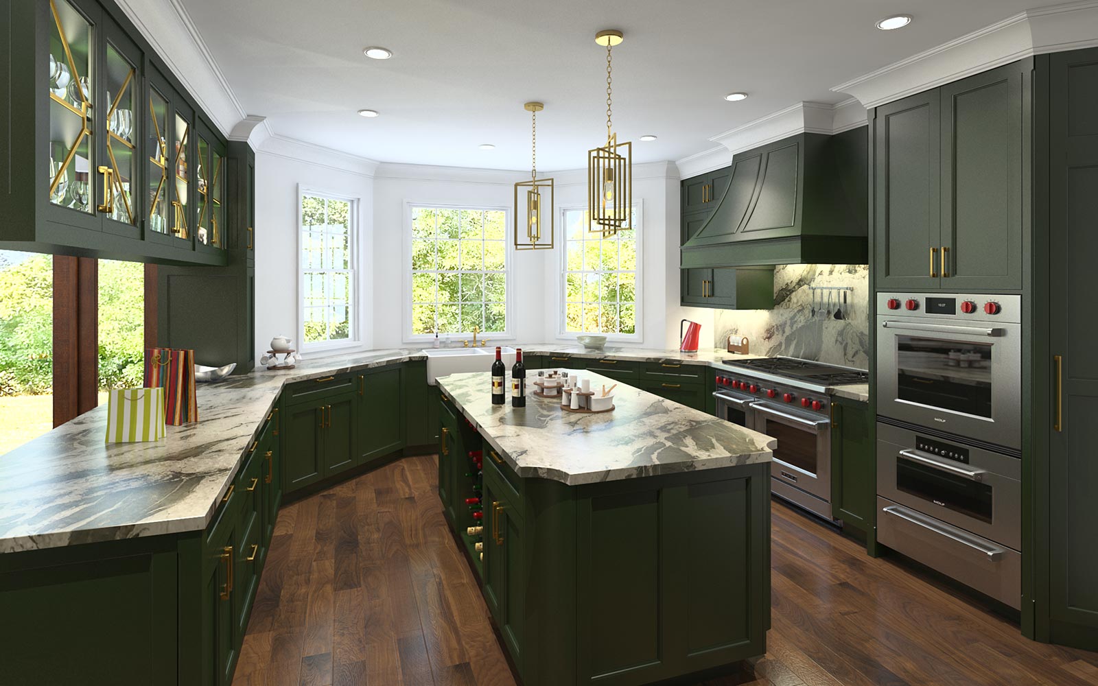 Rendering of new kitchen design for client in painted dark green and light wood stain.