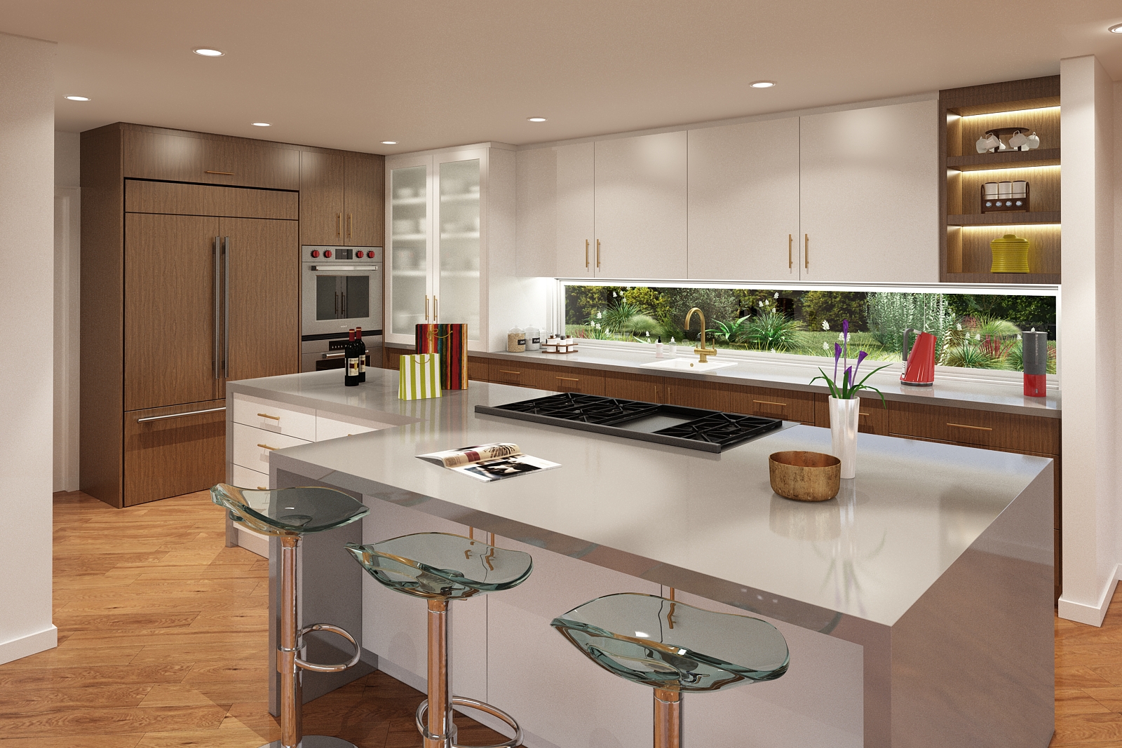 New kitchen render, full remodel. Dark and white stain wood mix for cabinets, waterfall stone island, and wood floors.